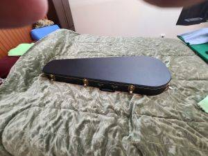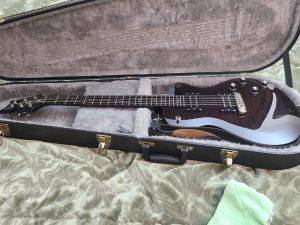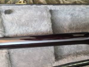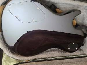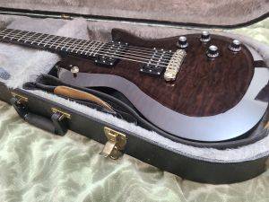 with quilted maple veneer and thick mahogany back, a 24.5” scale length, 22 fret wide fat