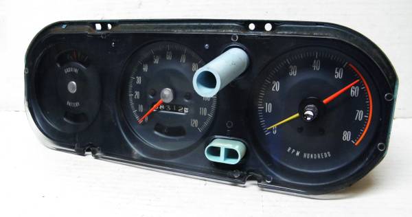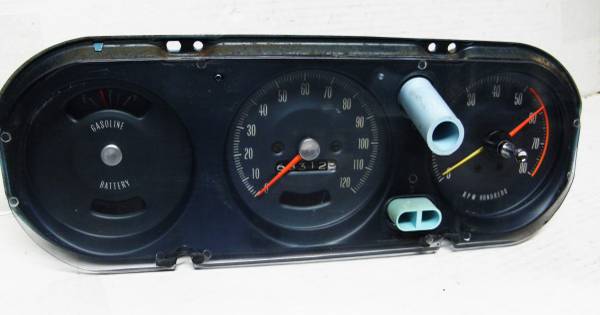 Pontiac motor division factory option rally dash gauges and tachometer in the third pod tach is 8 grand easy to read with shifter pointer, The first pod has a fuel gauge and the battery warning light the second pod has rally speedometer with parking brake warning light / low brake pressure light. Has original identification label on the back, tach is working $370.