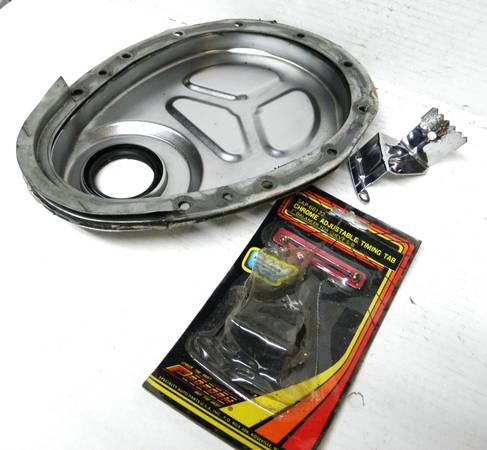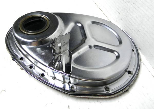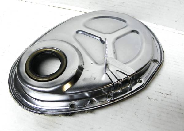Small block Chevrolet two-piece timing chain cover steel chrome with oil seal and timing tab, very clean original condition $95.