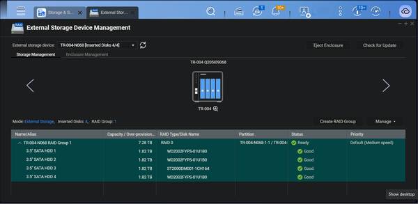 Use Storage & Snapshots Manager to configure the TR-004 as a storage expansion unit for your QNAP NAS. In addition to RAID configuration, the NAS expansion storage mode supports various NAS functions, including storage pools and snapshots. By choosing external storage mode, you can use the TR-004 as a DAS.