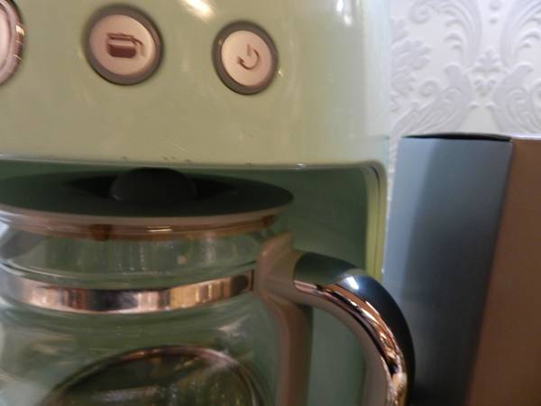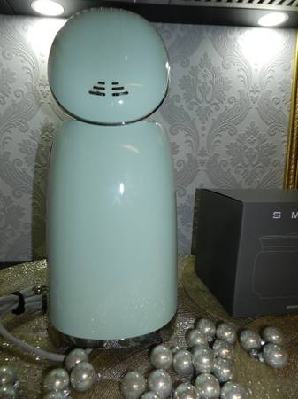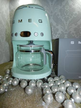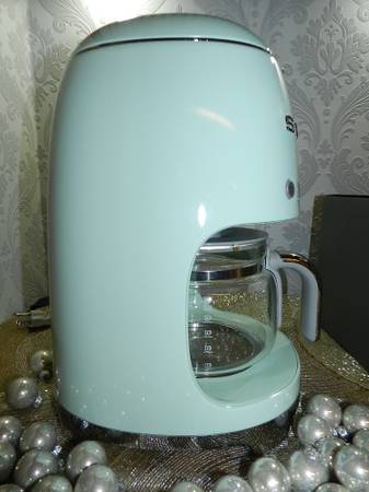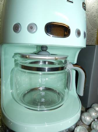 Great for the Christmas Smeg coffee machine in Pastel Green! Good for the cottage+trailer+camper+Airbnb++ Coffee machine is clean inside out and in good working condition. Purchased new replacement coffee pot like new. Coffee machine has some scuffs+ refer to photos. Used good working condition. Bagged and ready for pick up.