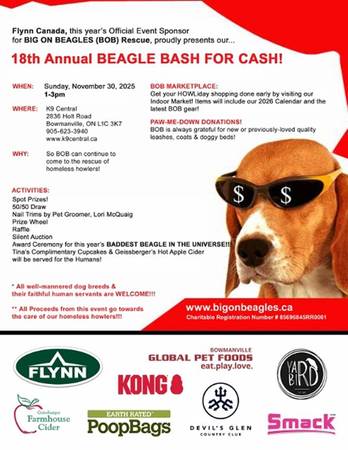 Please Join Us for Big on Beagles (BOB) Rescue's 18th Annual Beagle Bash for Ca$h! Happening on Sunday, November 30th from 1 PM - 3 PM at K9Central, 2836 Holt Road, Bowmanville, ON L1C 3K7