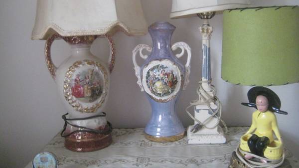 vintage LAMPS *BLUE--base only --$50--some damages on top rim *others--$75 each *pink with gold flowers--BOTH $95