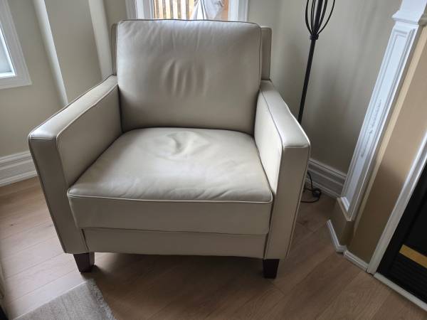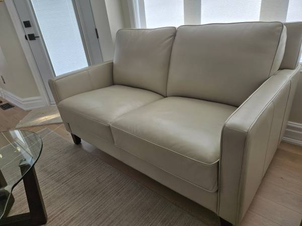 Custom made, two love seats, one chair and one storage ottoman. Top grain leather on seating surfaces, split grain on sides and back. 17 months old, very light use. Colour "Bedford Vanilla".