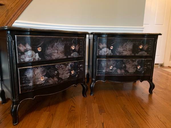 The nightstands have been painted inside and out. The outside has been painted in in Fusion Mineral Paint Coal Black with Rose Gold detailing. The drawer fronts have been decoupaged with Prima Re-Design “Uniqua”, a beautiful French and Floral design. The drawer sides have been painted with rose gold using the “lily Scroll” stencil. The inside of the drawers have been refreshed with Benjamin Moore Advance paint in white. The drawers are lined with pink striped paper (removeable). New crystal and rose gold drawer hardware complete the look.