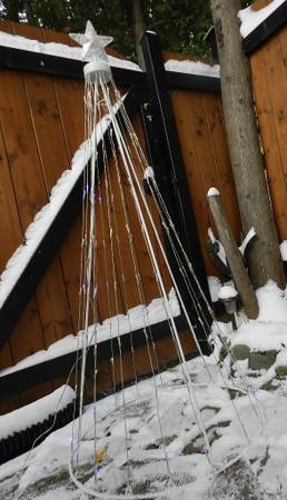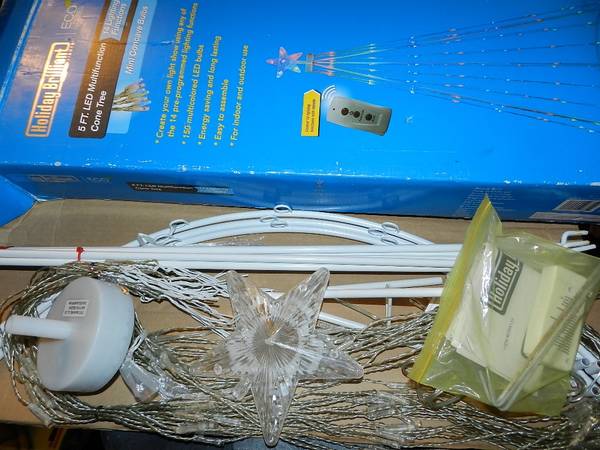 Holiday Brilliant Eco series 5ft Led multi function light show with remote control. Nice for the yard or display indoors. Creates a light show 14 function with 150 led lights. Frame is metal easy storage space saving. The star does not light up. Selling As Is
