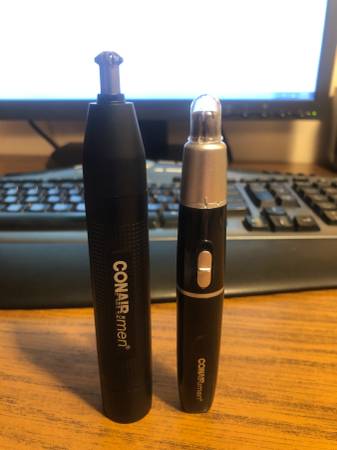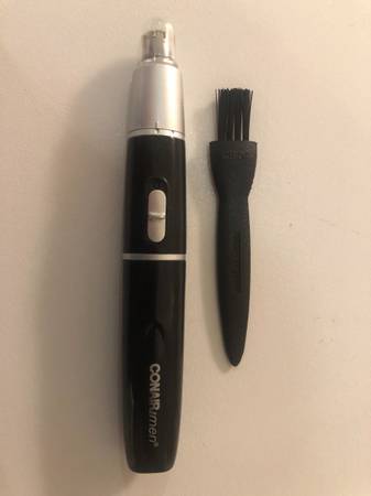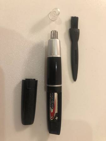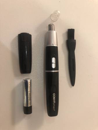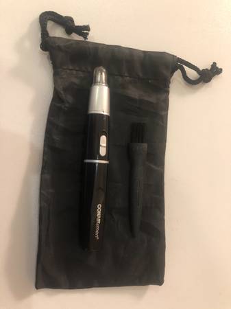 I have a CONAIR ear and nose hair trimmer that was purchased in early 2020 but has never been used. It is in perfect condition and uses one AAA battery. It comes with a plastic protection tip, a cleaning brush, and a black travel pouch.