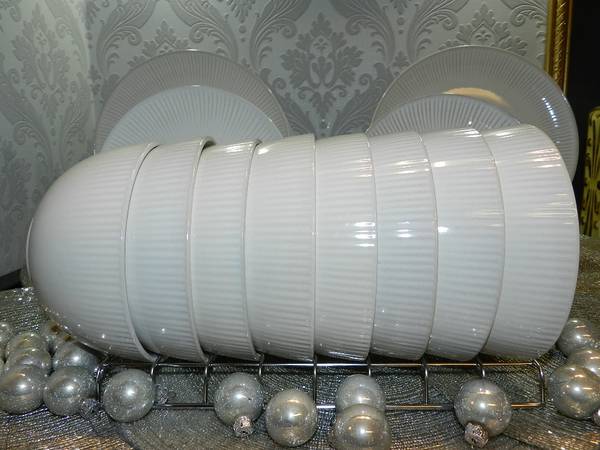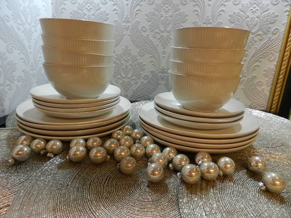 Perfect for Christmas entertaining. Cottage Decor+Farmhouse+Country stoneware dish set by Presidents Choice cream ribbed raised edge, microwave dishwasher safe. Natural glazed stoneware in Cream.