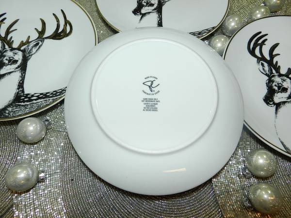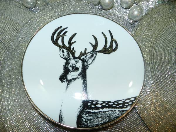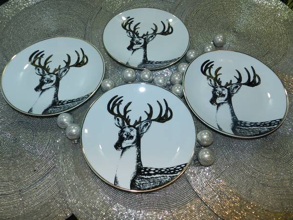 Cottage Decor+Farmhouse+Country dish set. Country farmhouse Reindeer PC plates with gold edging. Good used condition, no chips or cracks. Hand wash only. Clearing out my kitchen cupboards, check my other ads for great kitchen deals!