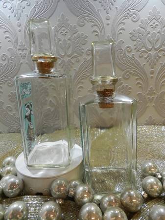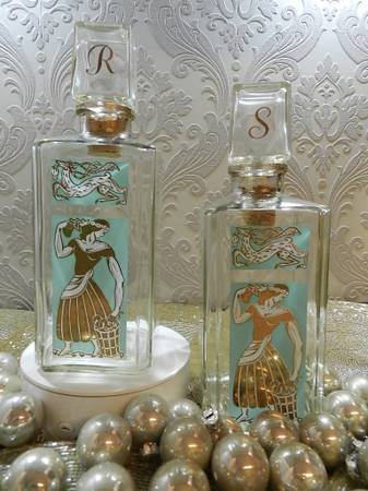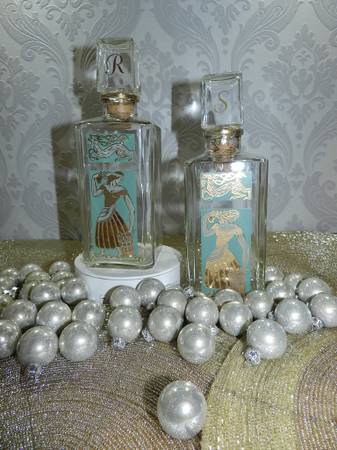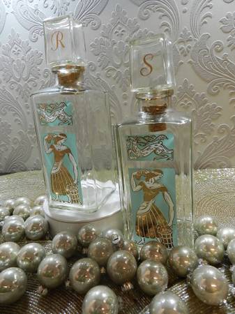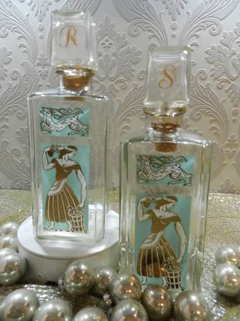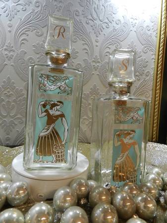 Set your amazing Christmas display with 2 Gay Fad Studios vintage barware, decanters graphics are in great condition. Designed by Fran Taylor painted in 22K and Turquoise hand decorated ware. Perfect for the MCM Hollywood regency bar.