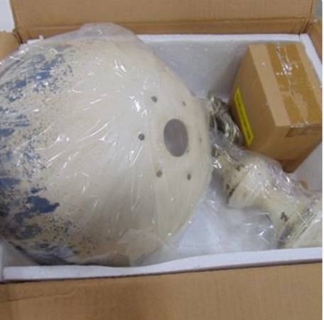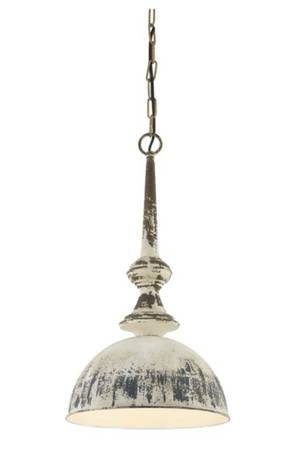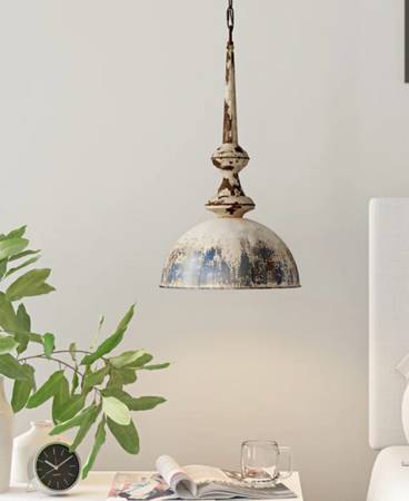 The distressed white paint dome gives away to a beautiful blueish black underneath with more touches of rustic, brown and cream towards the top of the fixture.