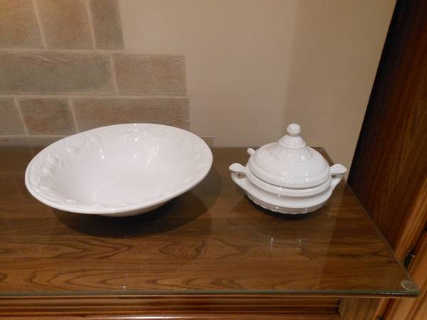 Picture 3: White Olive Embossed Bowl (13" diameter), Small White Covered Soup Tureen (ladle is broken, 7.5" diameter)