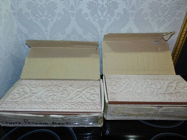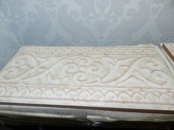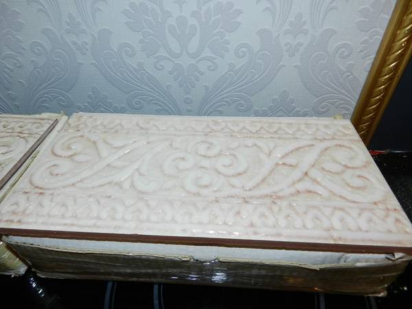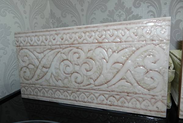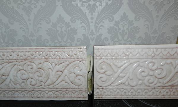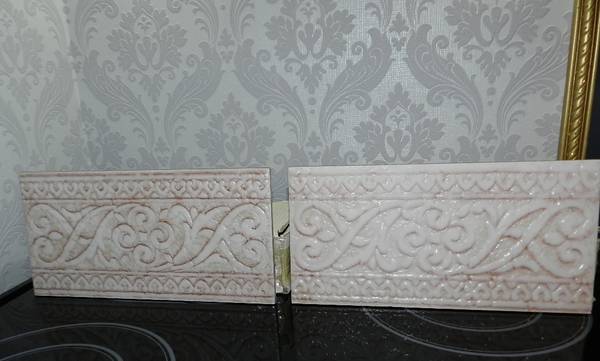 Gorgeous embossed relief decorative border tiles. Great for a back splash+kitchen+fireplace surround+mantle+++ Colour neutral with shades of soft pink+taupe+white. Hand made in Spain varying shades of soft colours. Cenefa Petunia Tiles