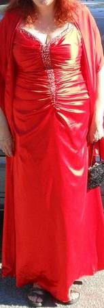 Women Red Sparkle Evening Dress Size 16 Dress has been worn once and cleaned (Dry Clean only) Zipper back. ESHA Design 100% Polyester Please note that the 2 pics worn show a personal scarf accessory...