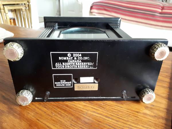 This Elegant BOMBAY Co. Working Mantel Clock, 3D Brass, Wood & Glass Case, Battery operated is made in 2004.
