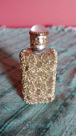 Decorated with enamel flower. Top has white stone and is attached to tiny stopper underneath lid. About 2 ½ inches high. Vintage item.