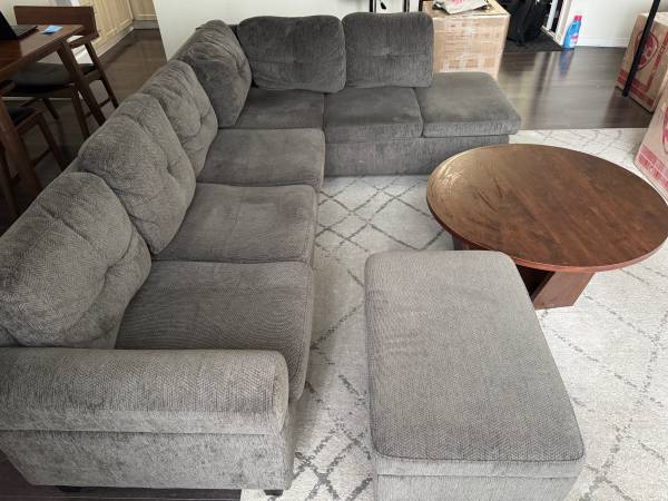 Package 4) Living room set-up with 55”TV, entertainment stand, sectional sofa and storage chest, round coffee table. $1,400
