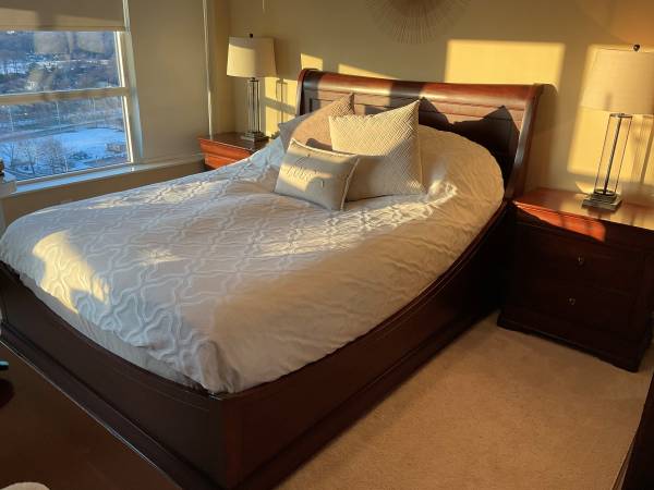 Beautiful 5-piece solid wood bedroom furniture set. Excellent condition and very well maintained. Made by Linwood Furniture, North Carolina, USA. The set includes a Queen Euro Sleigh Bed, Dresser,...
