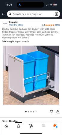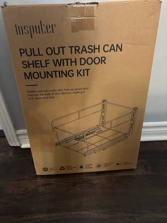 BNIB pull out trashcan shelf with door mounting kit. Bought online and works perfectly fine. Does not fit my existing cabinet. $70. Porch pick up from Winston Churchill and Argentia Road.