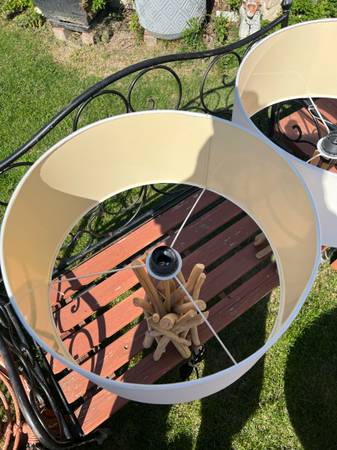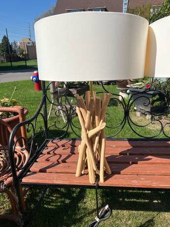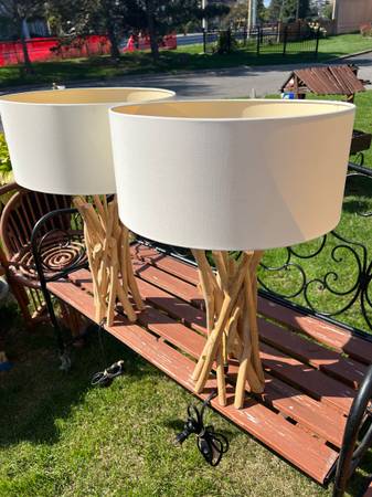 This Lovely Pair of Table-Lamps is made of Natural Wood Sticks and White Round Shade- $130 both/$70 each.