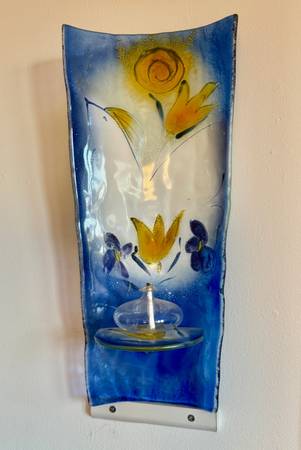 Beautiful hand crafted 3-piece glass wall decoration with white dove motif, purchased at Toronto's "One-of-a-Kind" show. Side sconces each have an oil lamp. Center piece measures 21” x 32”, and each side piece is 7” x 16”. Pristine condition. $50 or best offer.