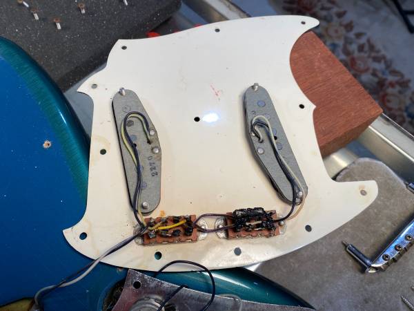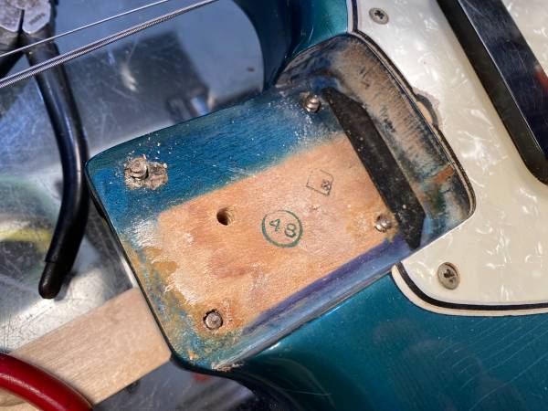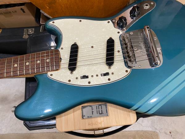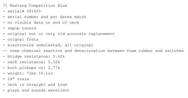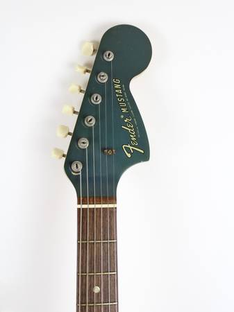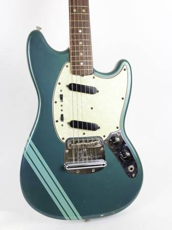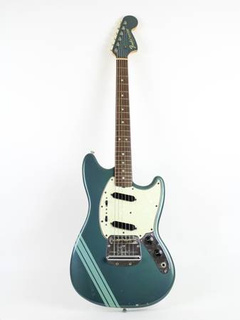 This 1970/71 Fender Competition Mustang in great condition and in perfect working order, complete with the original hardshell case (which is in less good condition. Finished in Competition "Burgundy" (Lake Placid Blue with racing stripe), this Mustang has been taken care of well over the past half century. If you look at the headstock closely, Tuners appear to have been removed and replaced at some point and then re-installed. Comes with original hardshell case and tremolo bar.