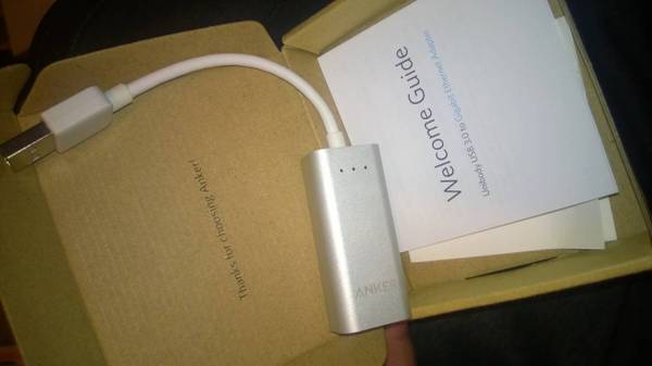 Package contents: Anker Unibody USB 3.0 to Gigabit Ethernet Adapter, welcome guide