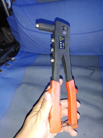 It appears to be a heavy-duty model with interchangeable rivet heads for different rivet sizes.
