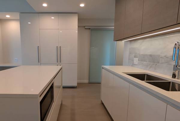 The condo has hardwood flooring, high-end appliances (fridge, freezer, dishwasher, microwave, stove), in-suite washer and dryer.
