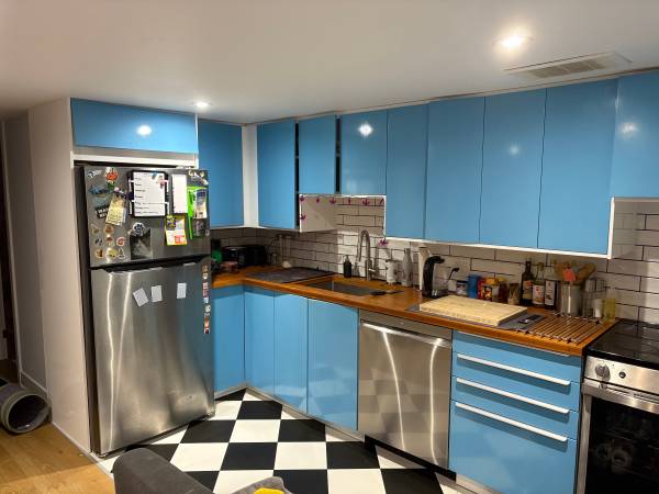 Available for rent as of January 1st on a 1+ year lease is a luxuriously renovated and classy one bedroom apartment of approximately 500 sq ft, a ground floor walkout in a 3-storey home. It has excellent natural lighting (floor to ceiling windows) and is located on a quiet tree lined street, backing onto a ravine, half a block from Jane and Bloor, across from Jane subway station (approx <1 min walk), in the heart of Bloor West Village with its numerous shops, restaurants, and other sources of entertainment. It is a 5 min walk from the Humber River and its parks, and 10-15 minutes from High Park. The grounds and rest of the property are kept in excellent condition by a local gardener and superintendent. The unit comes with:
