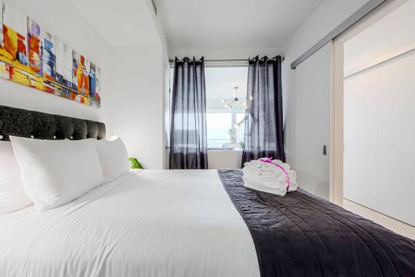 Stunning modern luxurious upgraded family friendly sparkling clean FULLY FURNISHED 1 bedroom 1 bathroom condo (Sleeps 4) with floor to ceiling windows, granite counters, stunning kitchen with stainless steel appliances, walkout balcony, big screen TV, and a fully equipped kitchen.