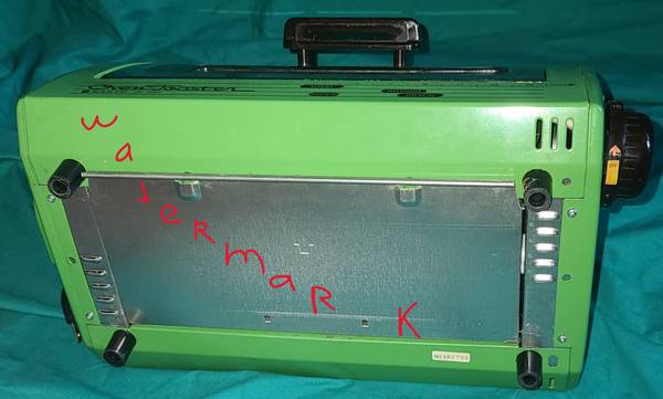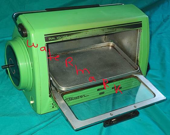 Rare, Original Green Sanyo Toaster Oven, with Unique Self Adjusting Electric Cord in Hub, Handle, Label, Model SK-7200, Made in Japan, c1970's-1980s,14” W x 8 3/4” H x 8” D, in very good condition, with wear including loose heat adjustment knob, but remarkably generally intact shell.
