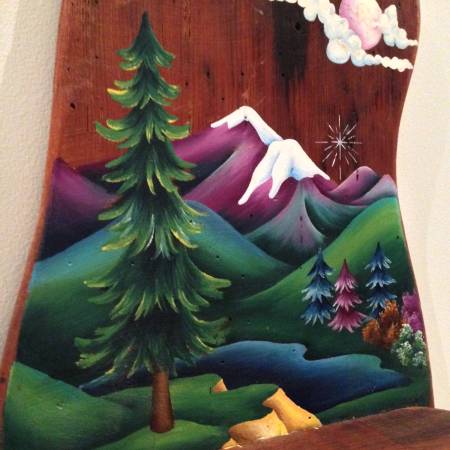 This one-of-a-kind hand-painted wood art shelf brings colour, character, and a touch of whimsy to any space.