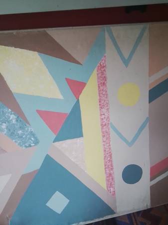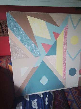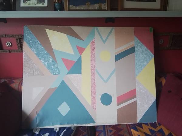 This is a large, used abstract painting on canvas, featuring geometric shapes and a unique colour palette. It has some wear and tear, as shown in the pictures, which gives it a rustic, vintage feel. Priced to sell for someone looking for an interesting piece of art on a budget.