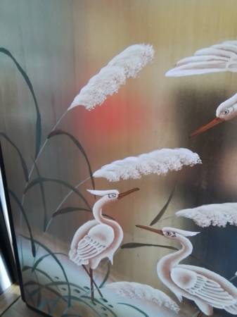 This is an antique Chinese painting, sized at 30 x 30 x 2.5 inches, featuring a serene depiction of cranes in a natural setting with a gold backdrop. It is a unique piece that would complement any collection. Being an antique, it has some wear consistent with its age, adding to its character.
