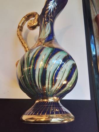 Made in Belgium decorative pitchers! These beautiful, used jugs feature intricate designs and gold accents, making them perfect for display. Their unique charm is sure to catch the eye of anyone who enters your home.