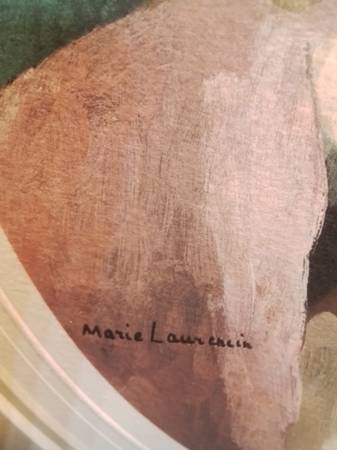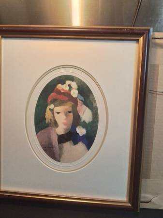 This artwork, attributed to Marie Laurencin, features an intriguing portrait in a gold coloured frame. The piece exhibits the artist's signature style. This is a used item, so please review images carefully.