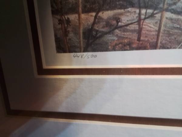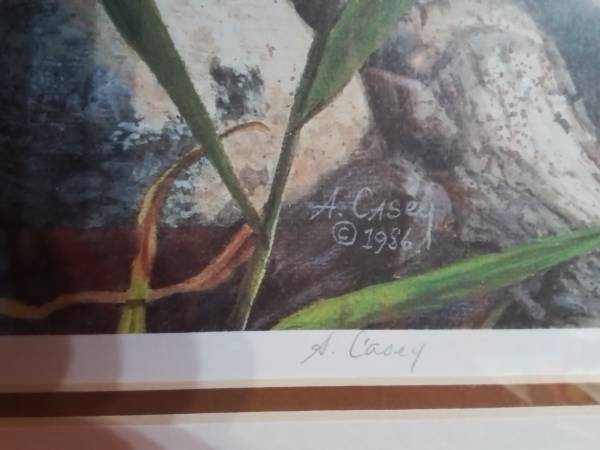 This is a framed and signed print by Manitoba artist Audrey Casey, titled "Chipmunk on the Rocks," numbered 448/500, and signed and dated 1986. It is in good condition.