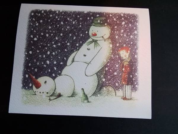 Lithograph on paper. This artwork features a whimsical winter scene with two snowmen—one standing with a green hat and scarf, and the other lying on the ground with its head detached. A young child with red hair, dressed in a coat and striped pants, stands to the right, observing the scene. "Banksy" printed on verso. Attributed to Banksy (England-based street artist). 15 cm x 18 cm