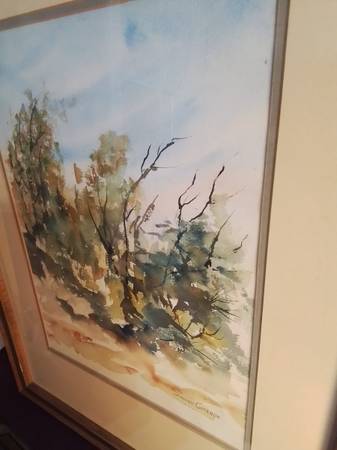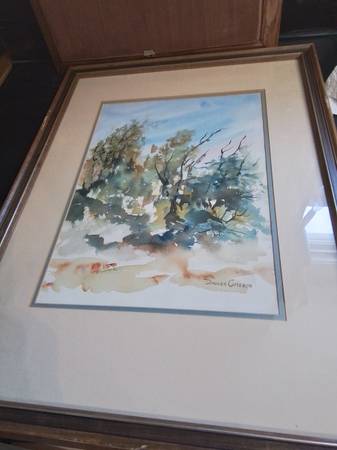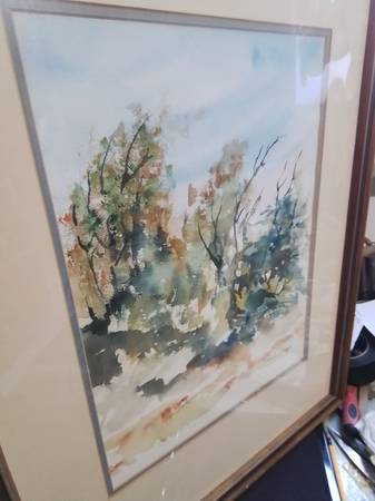 Beautiful watercolor landscape painting. Depicts trees in a natural setting. Presented in a wooden frame with matting. Artist signature visible.