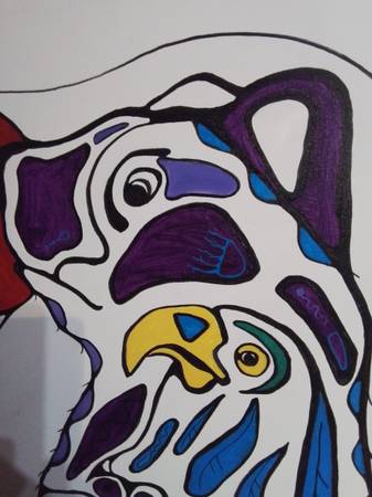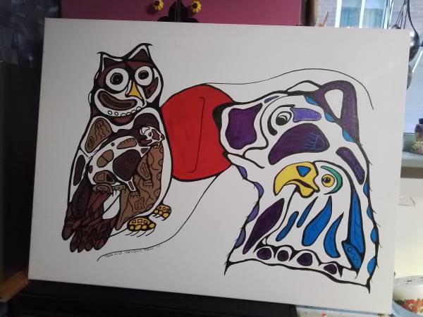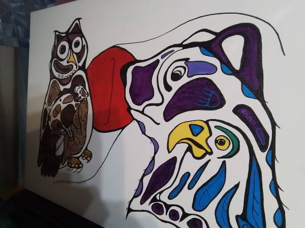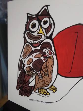 This beautiful piece features an owl and another indigenous animal in the artist's unique style. The painting measures 40x30 inches and is signed and dated '17 by the artist. It's a striking addition to any art collection! This is a used painting. Signed First Nations acrylic on canvas painting by Ton Wis Yayaka Ton. Dated 2017 30' x40"Good condition, unframed.see photos minor wear.