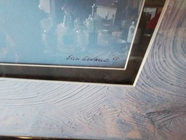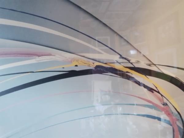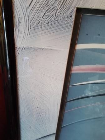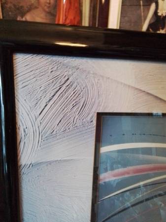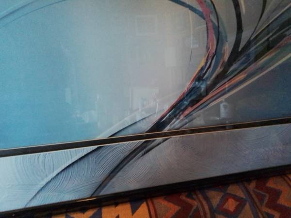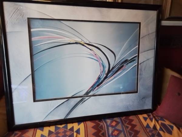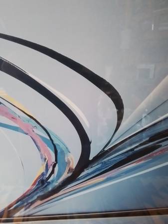 Framed Abstract Elba Alvarez Very large art work Large framed abstract art. Features colourful lines and curves on a light blue background. Black frame. Signed and dated 1989. Measurements 51.5 x...