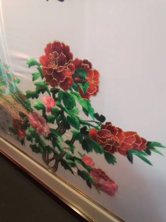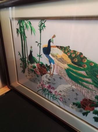 This framed, embroidered piece is a stunning display of traditional craftsmanship, featuring peacocks, bamboo, and flowers, all rendered with intricate detail and vibrant colours, plus elegant Chinese characters; the piece is in good used condition, ready to add a touch of elegance to any room. It is a beautiful piece!