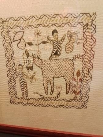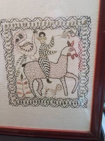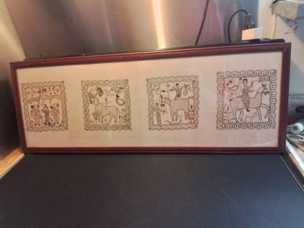This is a very cool piece of framed folk art I picked up a few years ago. It is from the Ajanta Art Gallery in Bangladesh and it depicts people and animals doing everyday activities. It measures 11" x 29". It is in good used condition. I'm asking $60 for it.