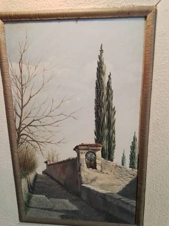 Framed Original Landscape Painting by Quo Vaelis Vintage framed oil painting. Depicts a pathway, trees, and a small structure. Cream-coloured frame with gold accents. Measurements approx 16 x 22.75...