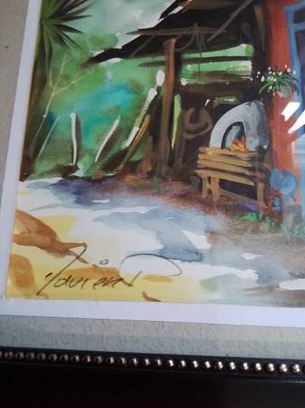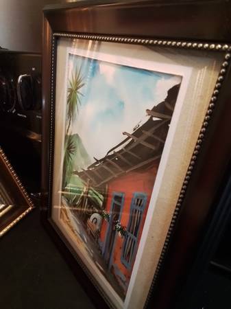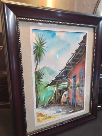 Original watercolor painting. Depicts a rustic orange house with a damaged roof, under a blue sky. Palm tree and mountains in the background. Signed by the artist. Presented in a dark wood frame.