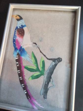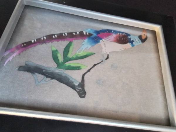 Beautiful framed artwork featuring a vibrant paper-cut bird. Intricate detail and colours. Silver inner frame, black outer frame. Perfect for adding a touch of artistry to your home décor. Measurements 6.75 x 8.75
