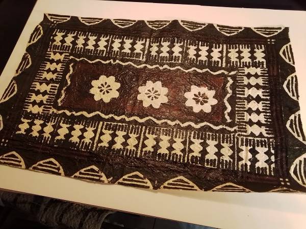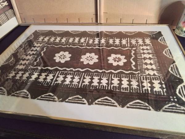 Beautiful framed piece of Polynesian tapa cloth. Features intricate designs in brown and off-white. Unique cultural artifact. Perfect for collectors or home decor.