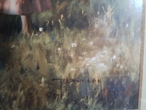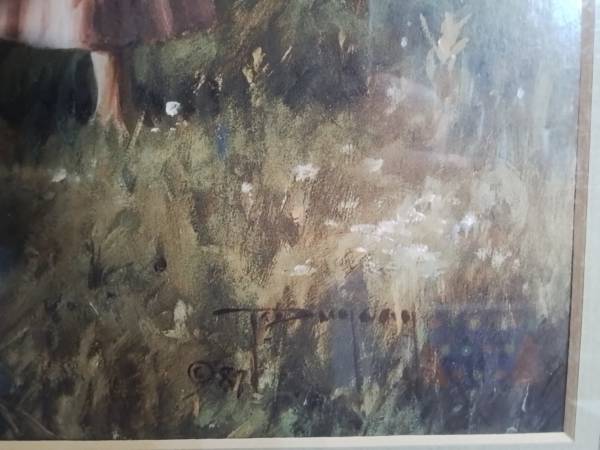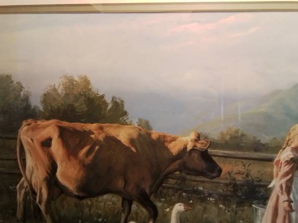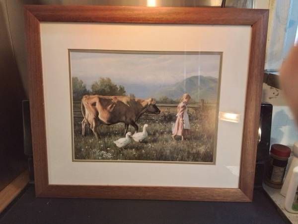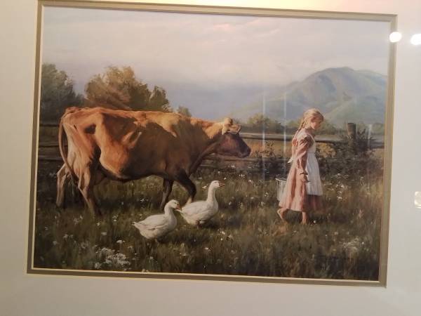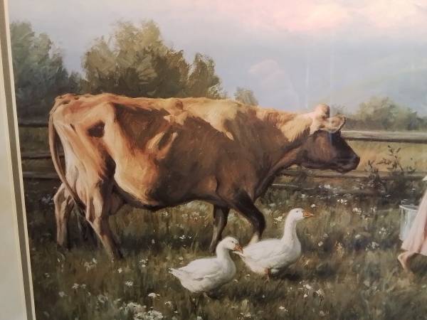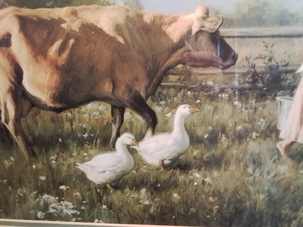 Framed art print depicting a young girl with a rake and basket in a garden. It is in good condition. Framed painting of a girl walking with a cow and geese.