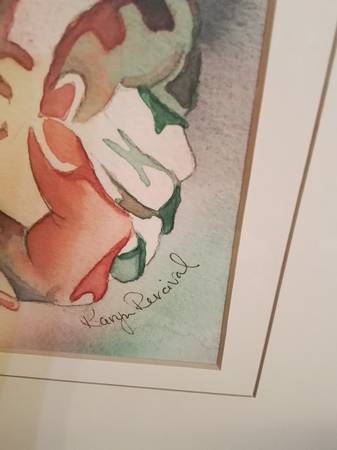 Original watercolor painting. Depicts two hands intertwined. Presented in a simple gold frame. Artist signature visible.
